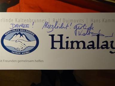 Aufgrund der dort gemachten Erfahrungen und den Erzählungen über die verheerenden Schäden durch das Erdbeben stellte der Vortragende statt eines Eintrittsgelds eine Spendenbox zur Unterstützung der Nepalhilfe Beilngries auf. Jetzt konnte die aufgerundete Spende von 500 Euro an die Extrembergsteigerin Gerlinde Kaltenbrunner, die sich mit anderen Bergsteigern für den Wiederaufbau einer Schule in Thulosirubari, Nepal, einsetzt, übergeben werden.